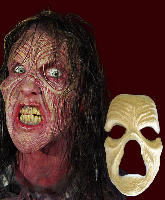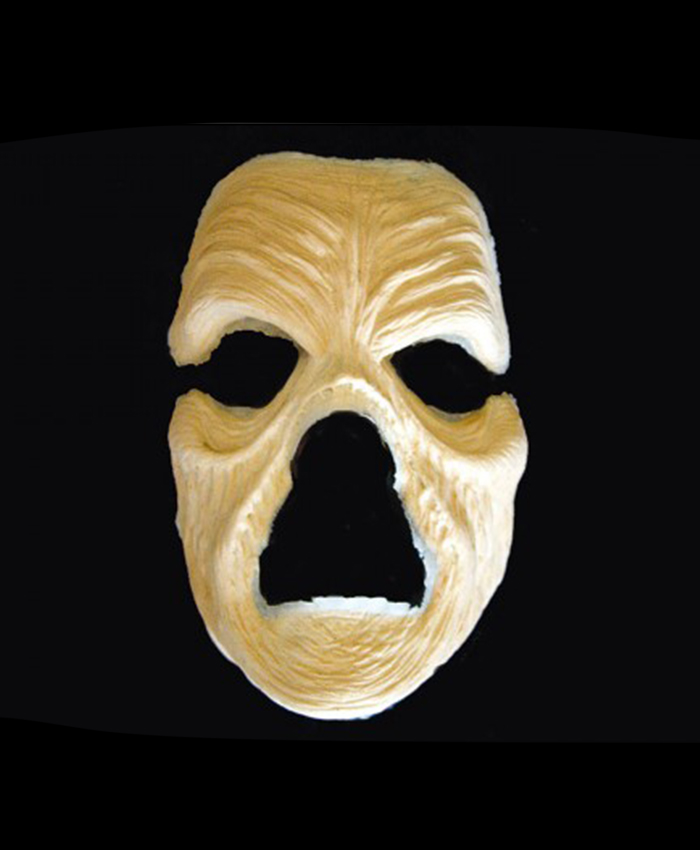 Prótesis facial completa de espuma de látex. Adherir con pros-aide a la piel, preparar la superficie con castor seal y pintar con pinturas grasas.